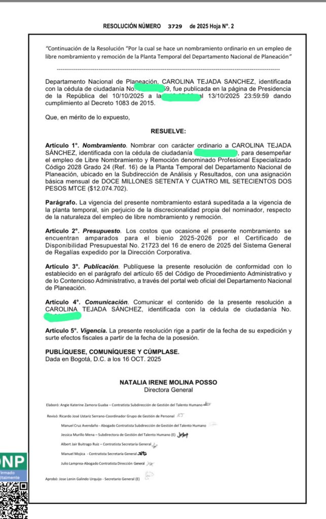 De acuerdo con los documentos revisados, Tejada Sánchez fue nombrada el 16 de octubre de 2025 en un cargo de libre nombramiento y remoción como profesional especializada, con una asignación básica mensual cercana a 12 millones de pesos.